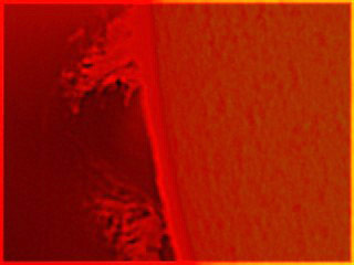 © P. DingleyThe Sun on 7th May 2003 using a Canon D60 digital camera and a Celestron C-150 6 inch Refractor with a hand-made $15 Solar Filter.The last few seconds of the 2003 Mercury Transit seems Mercury barely visible as it moves away from the face of the sun. Fourth contact is within a few seconds of this photo being taken.