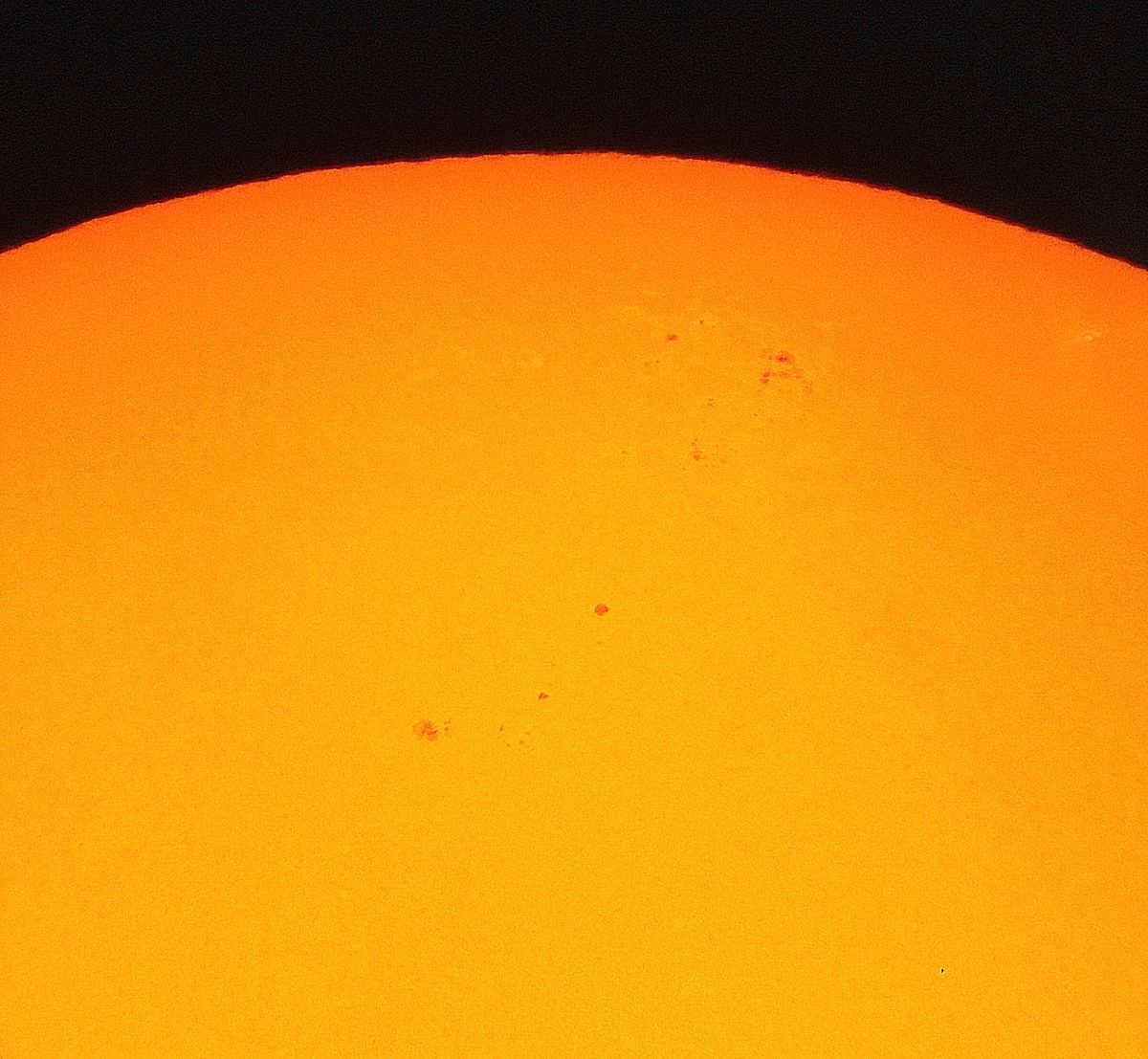 © P. DingleyThe Sun on 29th September 2002 at 15:00 GMT using a Canon G-2 digital camera and a Meade ETX-90-EC with a hand-made $15 Solar Filter.Two clusters of sun-spots are clearly visible in the image, one to the left, and one just off centre to the right, with a third cluster just visible near the extreme left side of the image.
