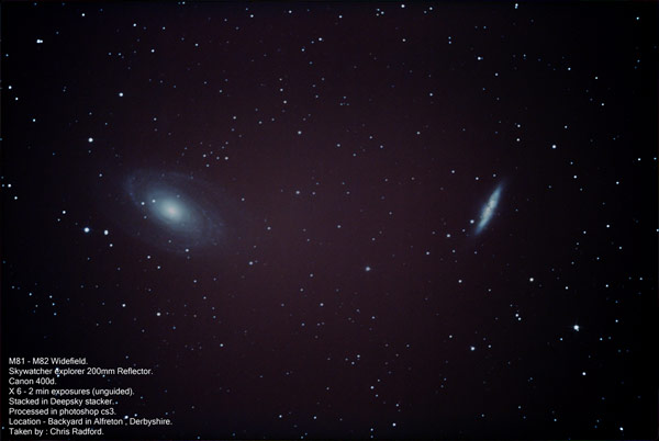 © C. RadfordThis image of M81 (Bode's Galaxy) and M82 (the Cigar Galaxy) was taken by society member Chris Radford, and submitted to the June 2008 picture of the month contest.The image was taken from Chris' back garden in Derbyshire, and consisted of 6 x 2 minute unguided exposures, taken with a Canon 400d digital camera, stacked using DeepSky Stacker, and then post-processed using Photoshop.