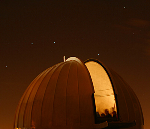 © P. DingleyThe constellation of Ursa Major, also known as The Plough or the Great Bear, is prominent over the top of the dome during the open evening on November 29th 2003. The orange coloured glow pervading the image is due to the local light pollution from the nearby town of Mansfield, and the sodium street lighting on the nearby Coxmoor Road.Thankfully since his picture was taken the local street ilghting has been changed from the open style sodium lights to full cutoff lighting which is far more dark-sky friendly, and means that the public money spent on lighting the streets is doing just that, instead of being wasted pointlessly lighting the sky.